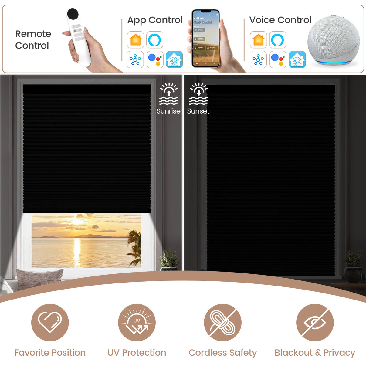 Operate shades via app, voice, or remote—total convenience at your command.