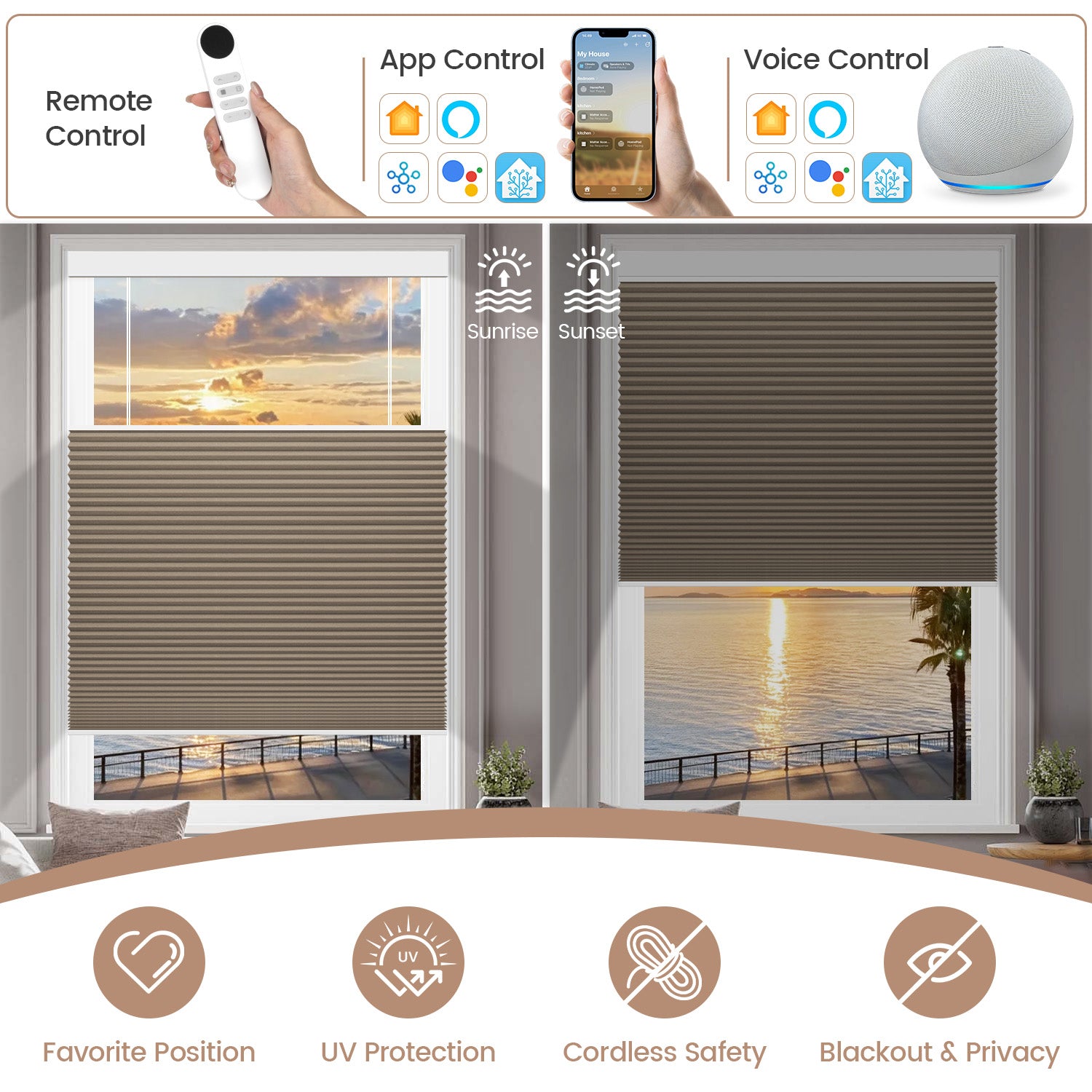 Operate shades via app, voice, or remote—total convenience at your command.