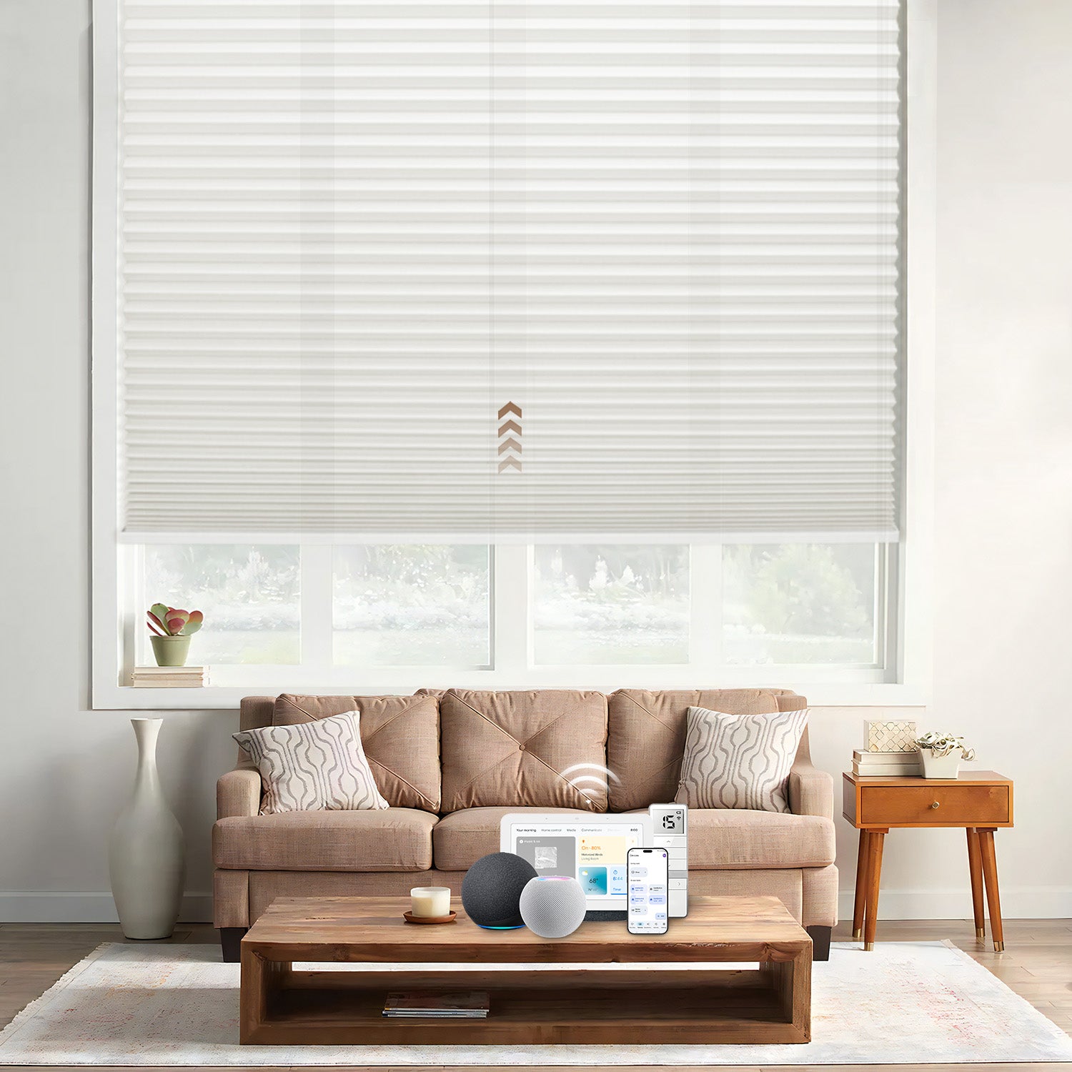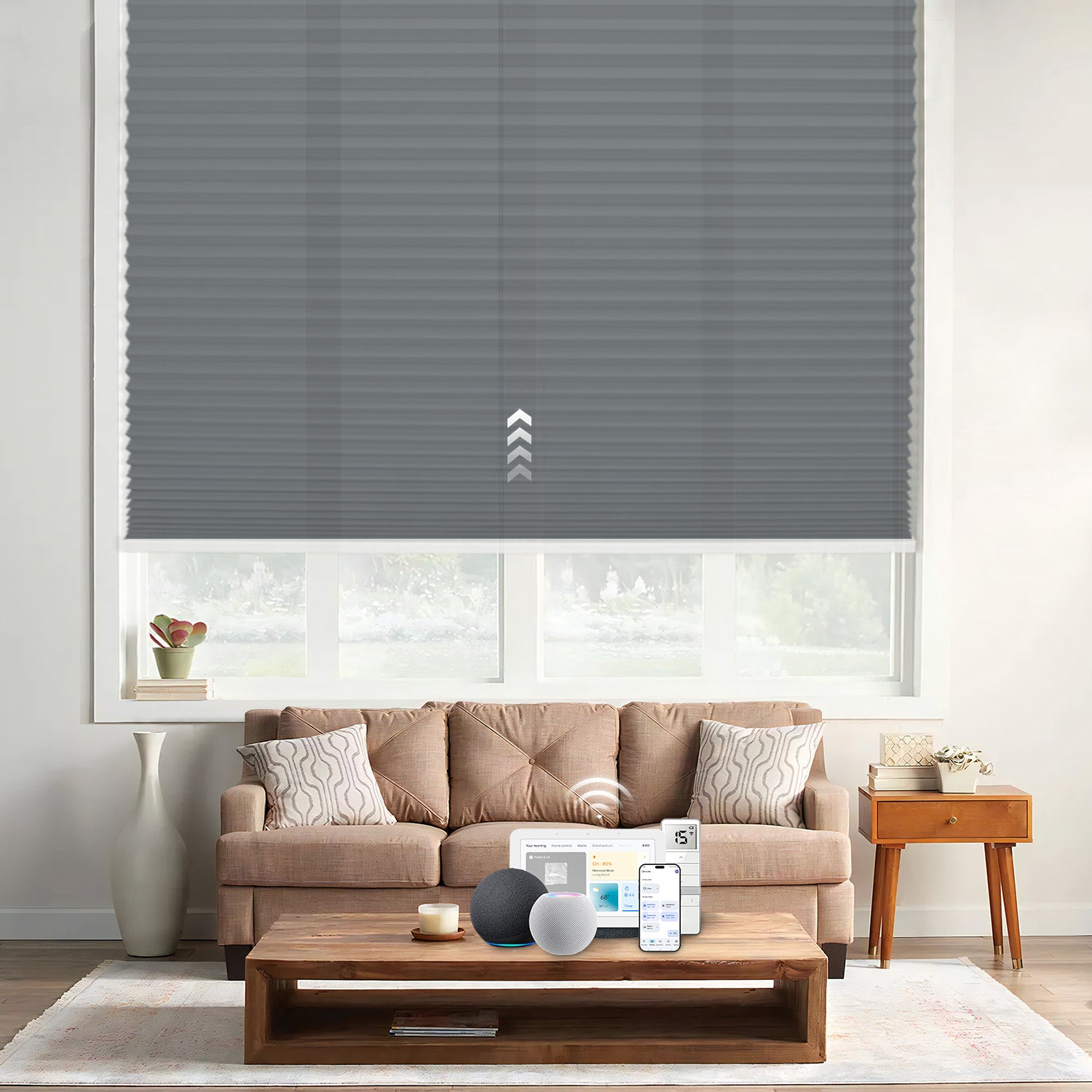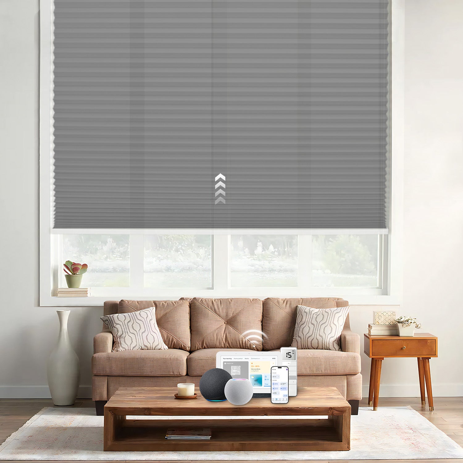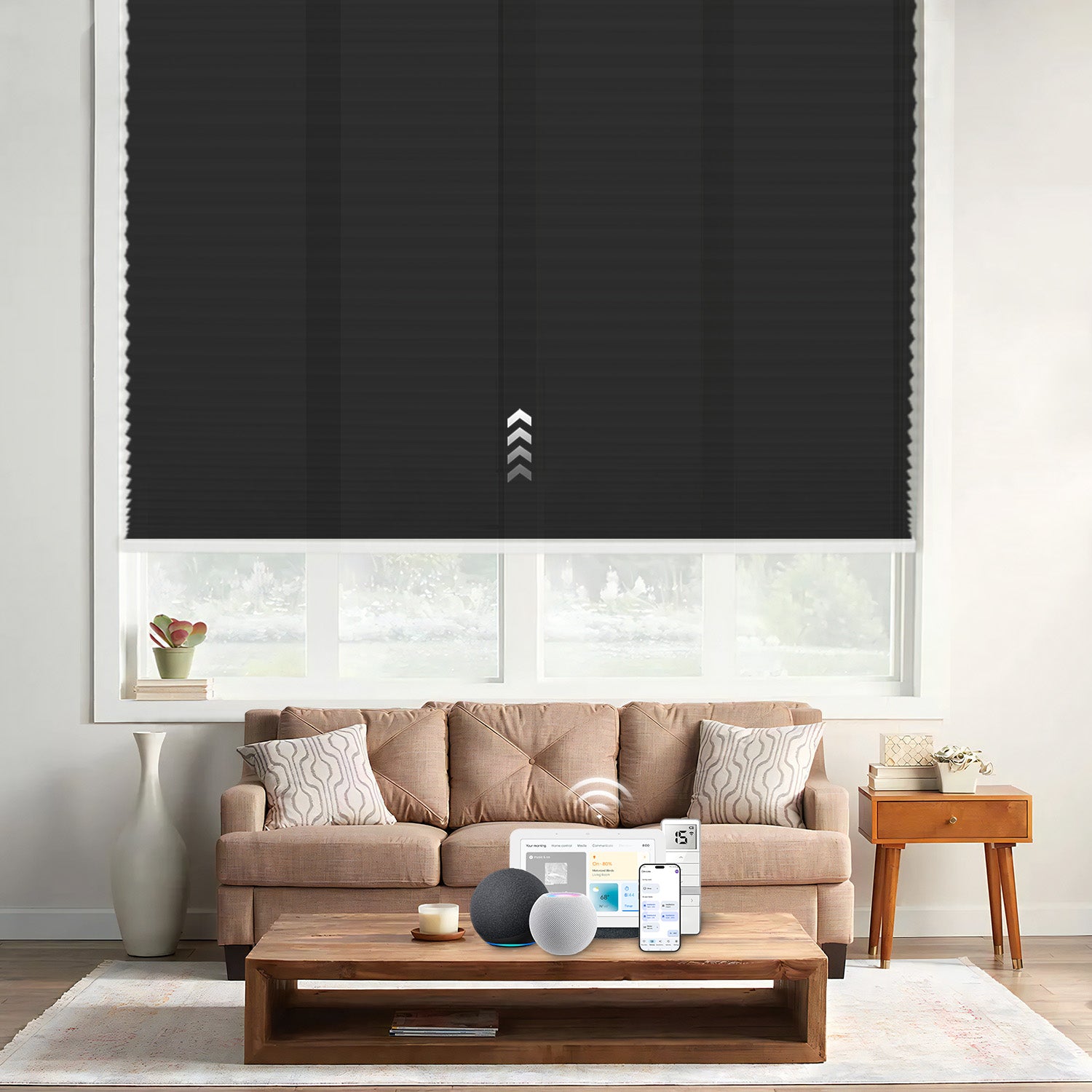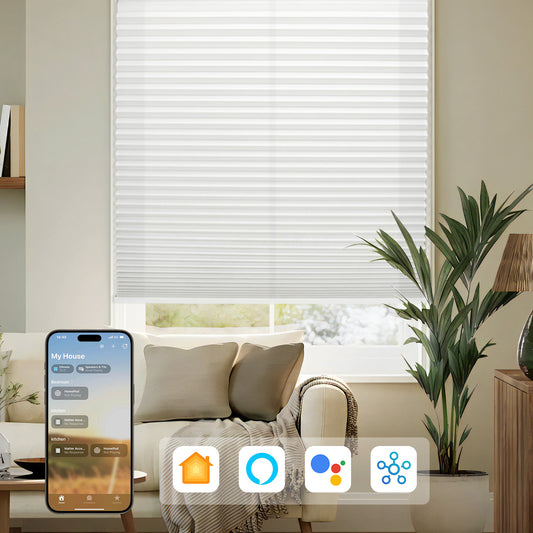 Control your shades effortlessly with Amazon Alexa, Google Assistant, or Apple HomeKit. Use a simple voice command or app to enjoy a smart home—adjust your shades instantly with just one command.