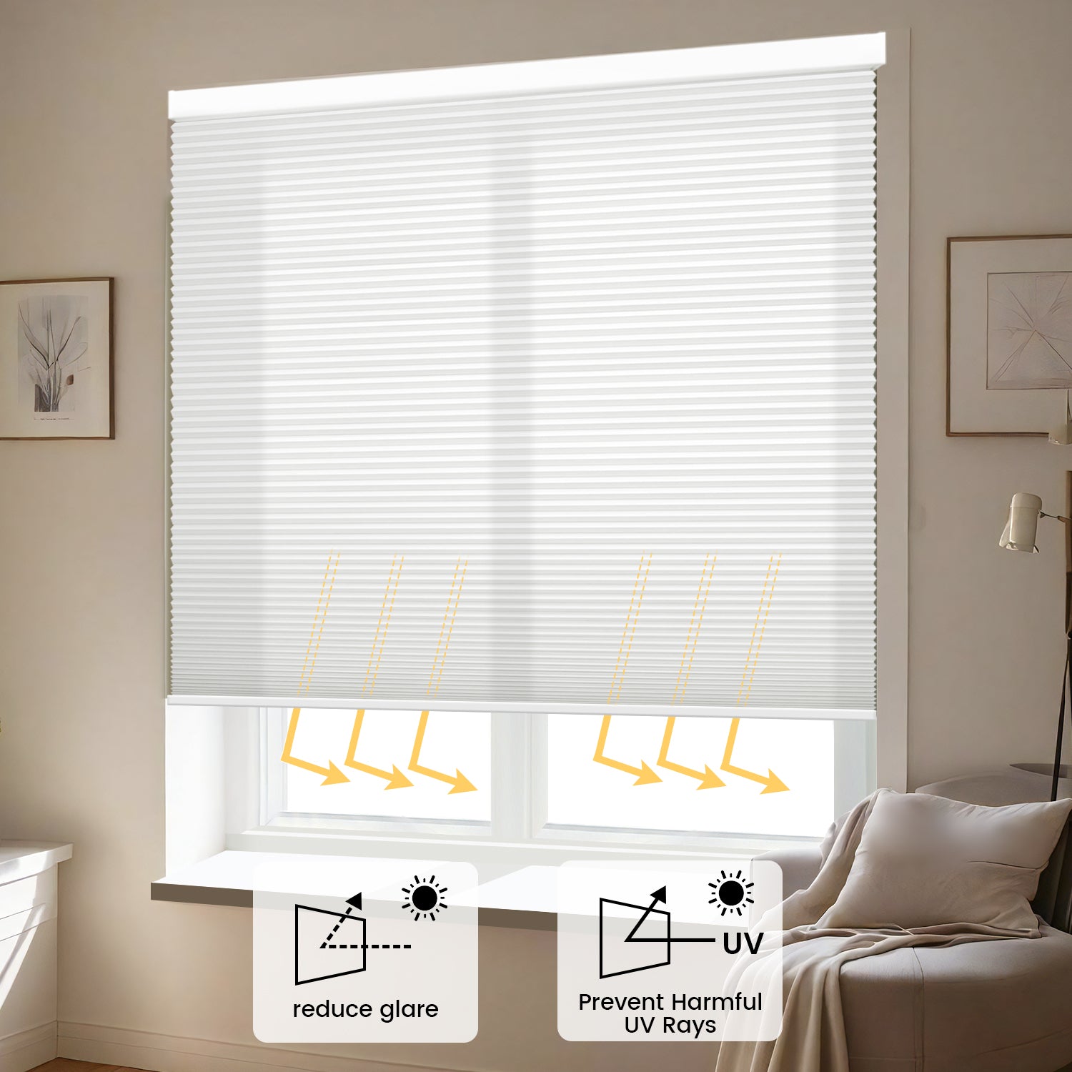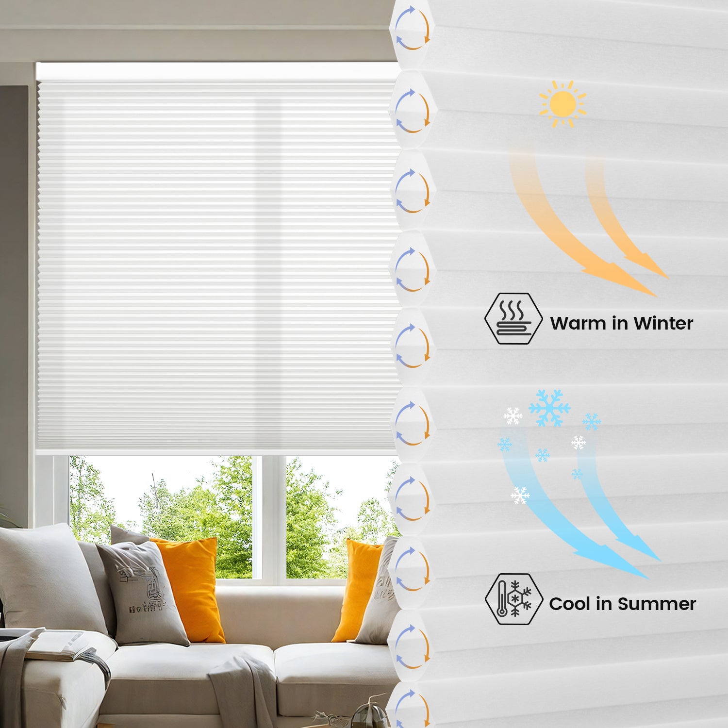 Cuts heat, softens light. Honeycomb cells trap air to insulate, lowering energy use.
