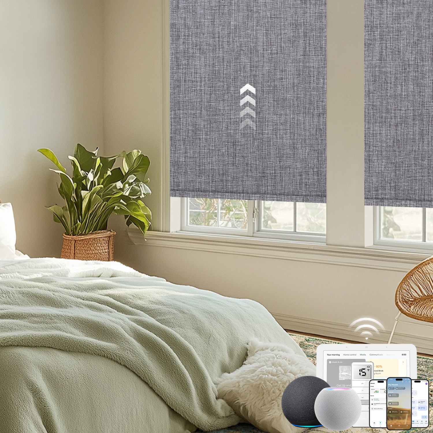 Control your motorized shades from anywhere using a smartphone app, offering convenience and flexibility at your fingertips.