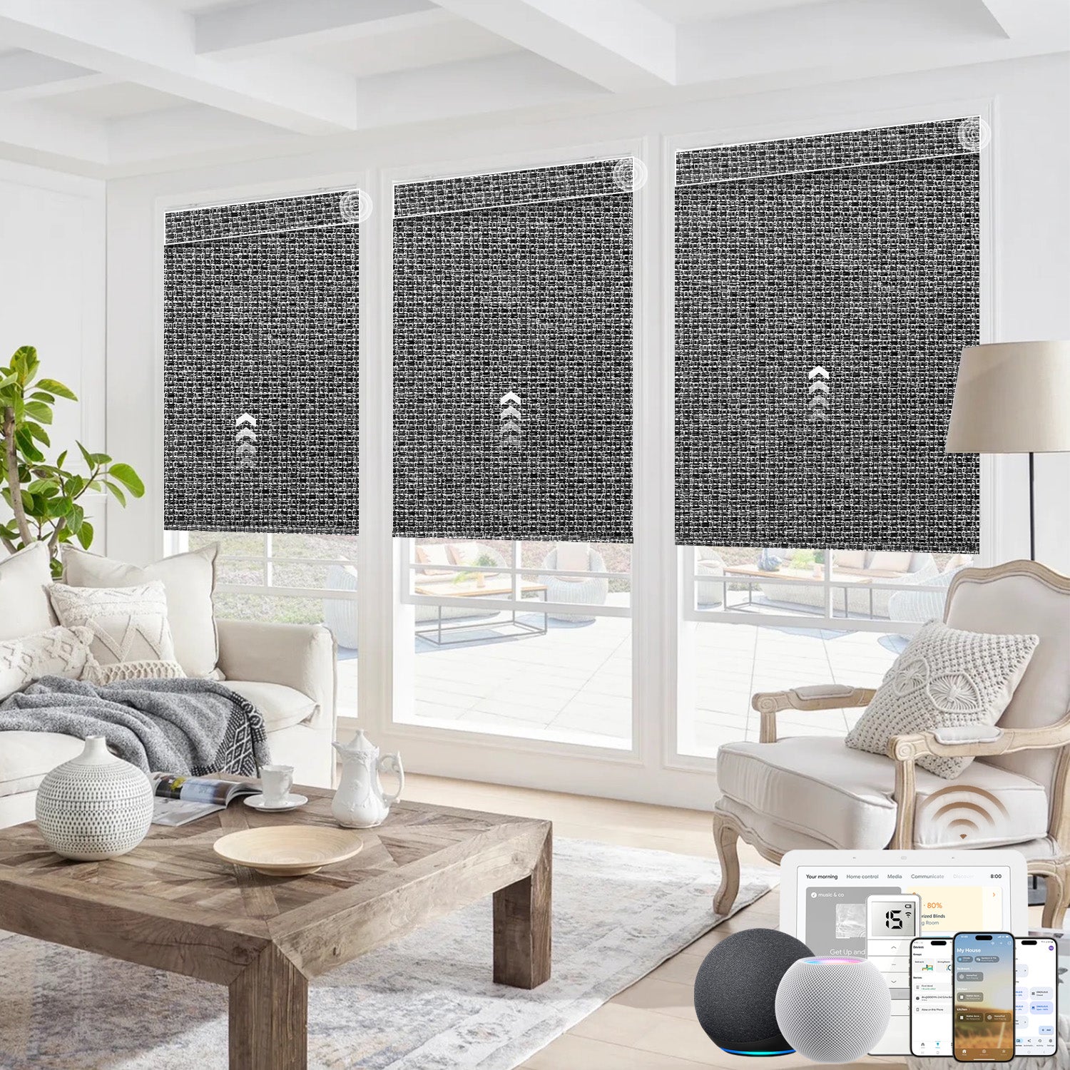 Control your motorized shades from anywhere using a smartphone app, offering convenience and flexibility at your fingertips.