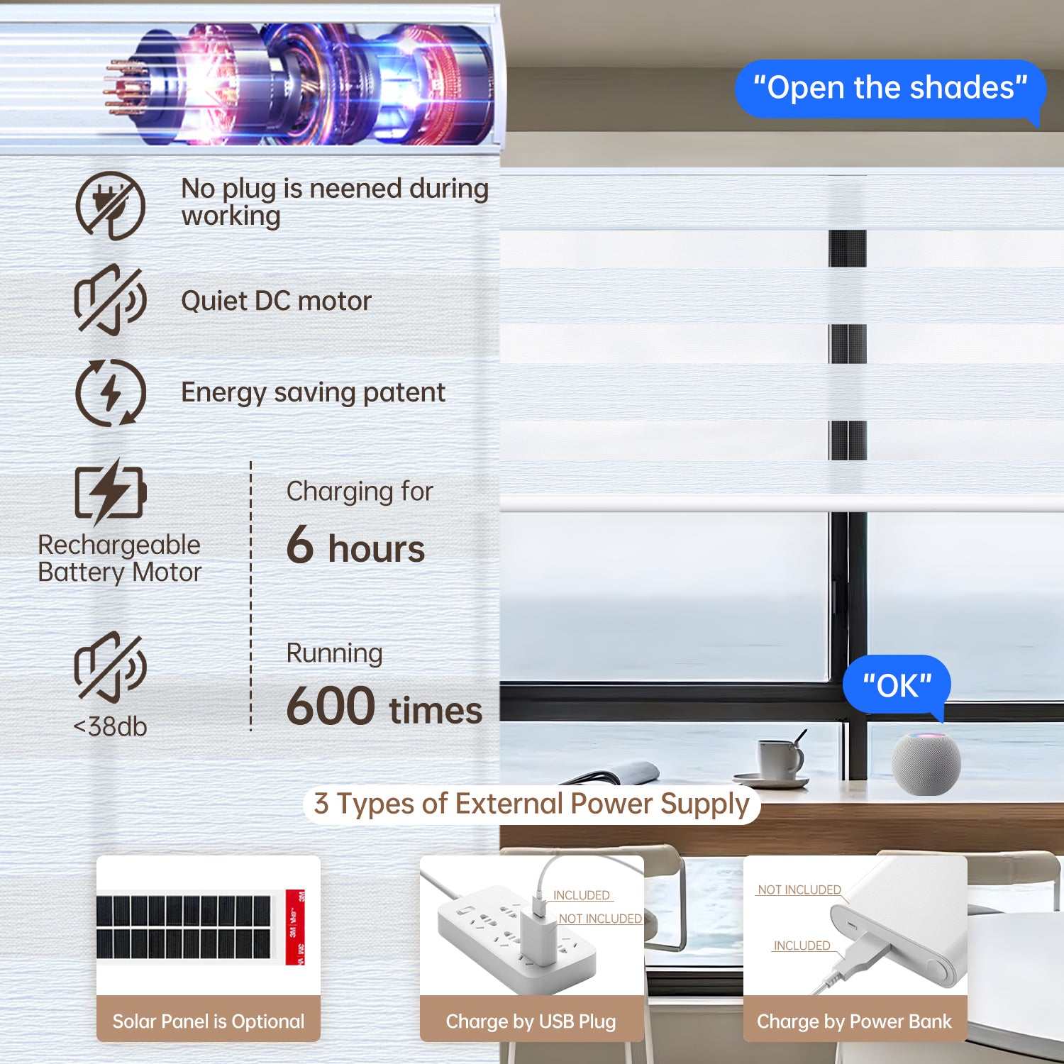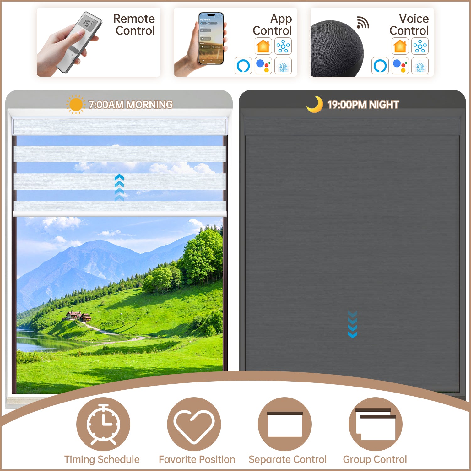 Control your shades effortlessly with Amazon Alexa, Google Assistant, or Apple HomeKit. Use a simple voice command or app to enjoy a smart home—adjust your shades instantly with just one command.