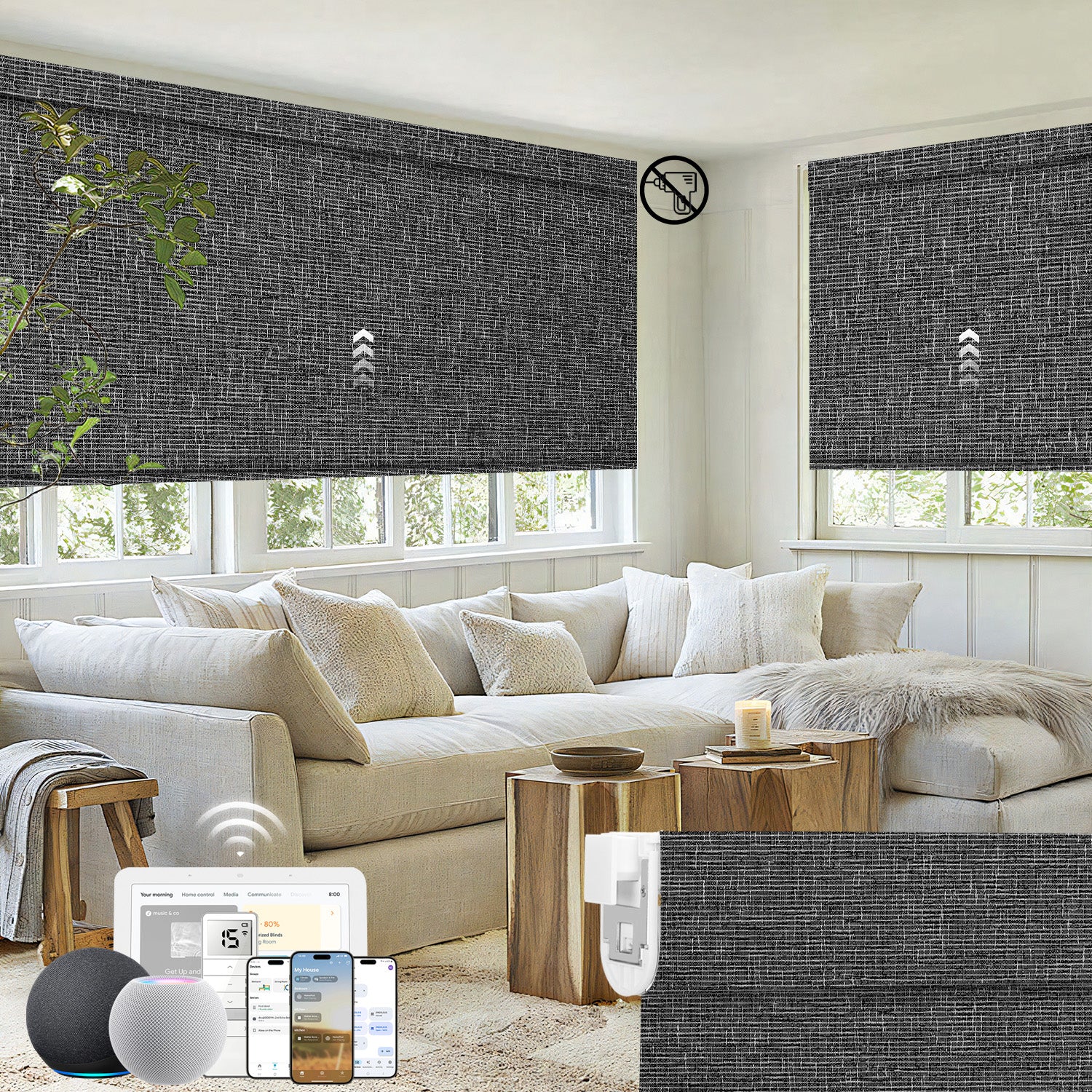 Control your motorized shades from anywhere using a smartphone app, offering convenience and flexibility at your fingertips.