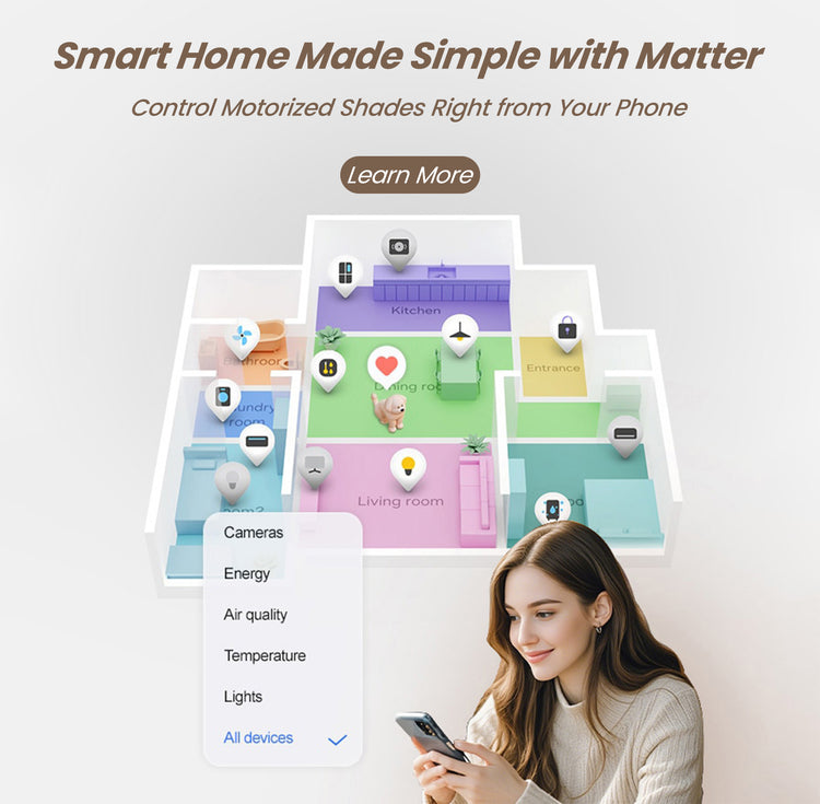 Kincmo motorized shades are powered by Matter over Thread technology, ensuring compatibility with major smart home systems.